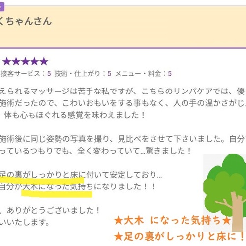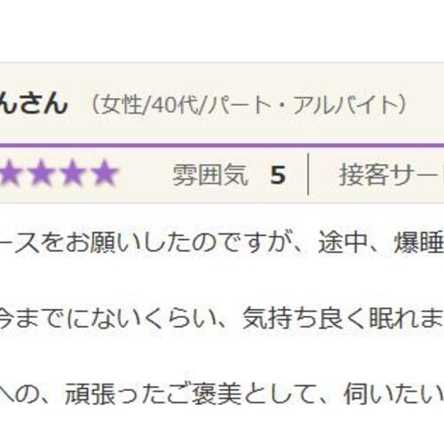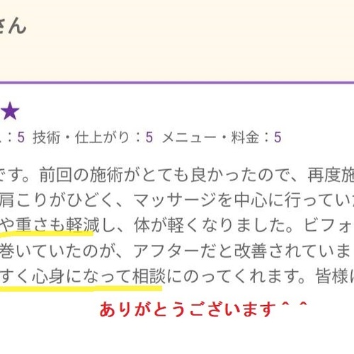 特に右側に痛みがあったので、腰、肩を中心に施術をしていただきました。その都度、細かく痛みがあるかないか聞いてくれるので答えやすく、最後には痛みもコリもなくなり、スッキリしました。