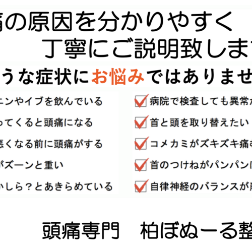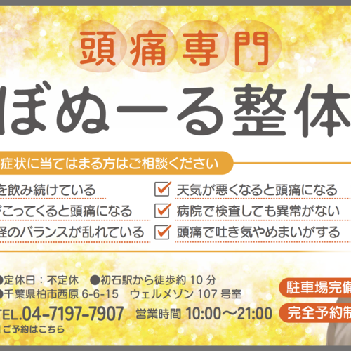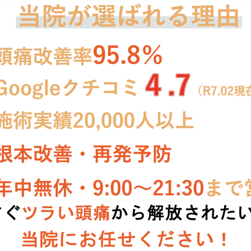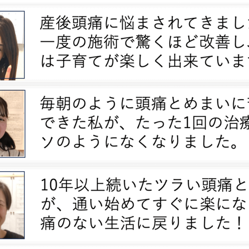 この度は、ご来院いただきありがとうございました。私も以前は頭痛に悩まされてきたので、お客様のお気持ちはとても良く分かります。一緒に頭痛を克服しましょう!