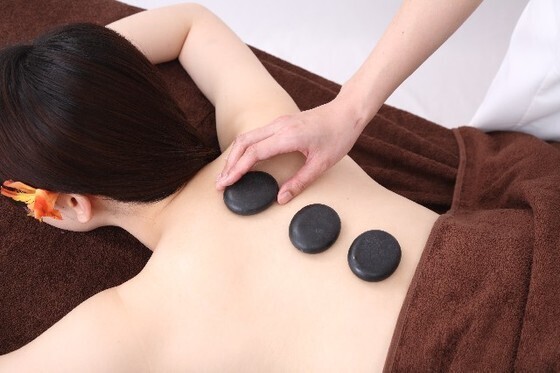 症状に合わせたアロマオイルで、首元から足の裏まで全身を丁寧にマッサージしていきます。さらに、50℃に温めたストーン(玄武岩)を使ってマッサージします。