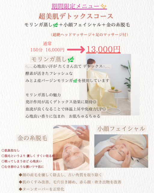 初めてのエステを任せて頂きまして心から感謝いたします♪モリンガ蒸し、フェイシャル、ボディ、ヘッドマッサージまで、たっぷりコースをご体感頂き、施術後はスッキリ軽やかに、そして お肌のトーンアップ、リフトアップに私も感動しました(^^)嬉しいお言葉 ありがとうございます☆