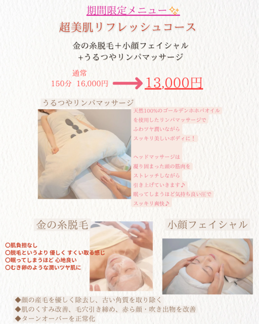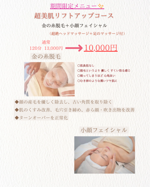 はじめて来店させていただいたのですが、明るい笑顔で出迎えてくださり、施術も本当に丁寧で終わる頃には心も身体も軽くなりました!終わった後に鏡を見るとノーメイクのはずなのにお肌のトーンも明るくなり、肌にふれた感覚もしっとりもっちり潤ってさわると気持ちよかったです!また、ぜひお願いしたいと思いました。ありがとうございました!
