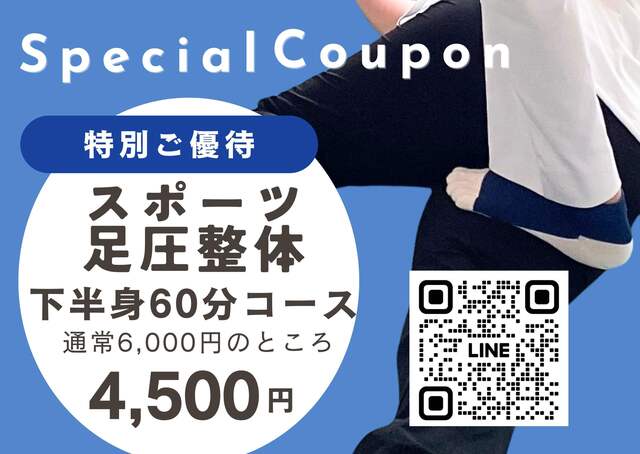 【通常60分6,000円のスポーツ足圧整体が4,500円になるLINE登録特典メニュー※お一人様一回限り】