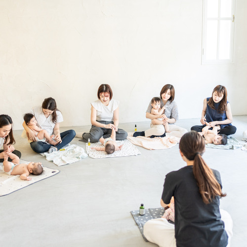 親子向けのベビーマッサージレッスンと、ベビーマッサージ講師を目指す方向けの資格取得講座を開催しています。