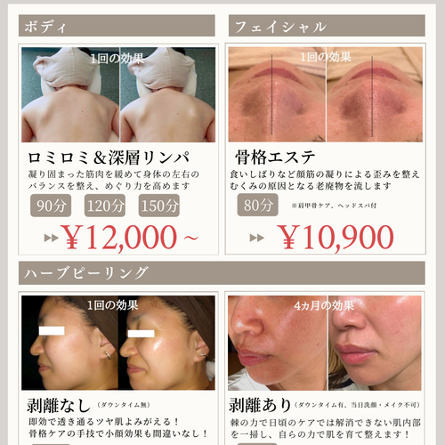 また、人気の【💆骨格エステ】では、長年の経験と知識から持続を可能とした、背中・頭の深層のコリから先にほぐす流れを取り入れたエステ。顔の筋肉が緩みやすい状態をつくり、左右差・たるみ・くすみ・むくみに効果的にアプローチ。酸素オイルで筋肉を柔らかく整えることで、引き締まったフェイスラインへ導き、さらに骨格まで整えることが可能。