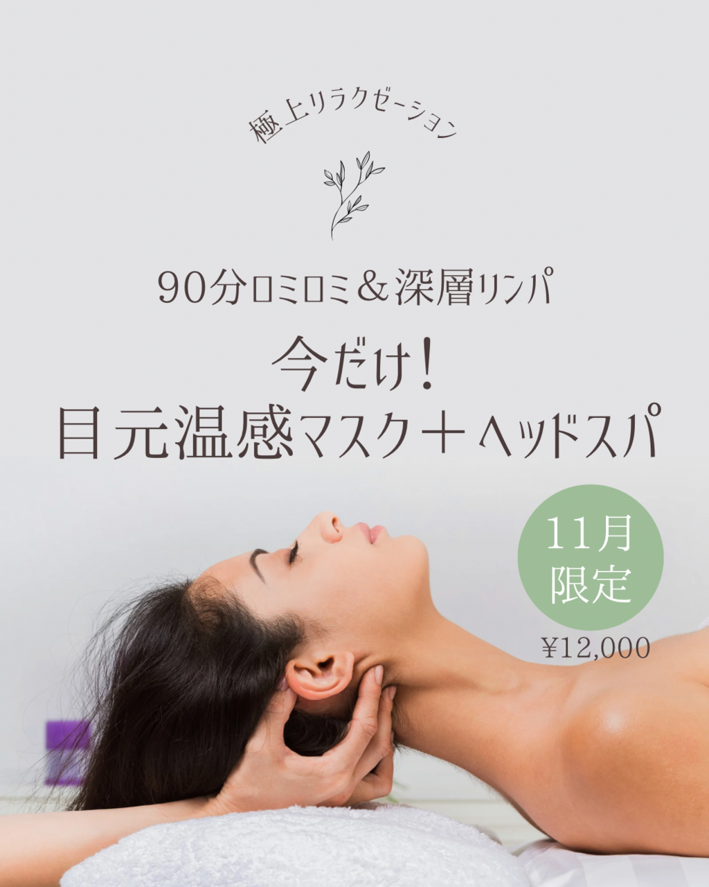 満足度No.1【90分オーダーメイド施術】ロミロミ&深層リンパに、今だけ!目元温感マスク+ヘッドスパ付✨