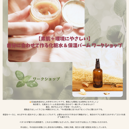 【素肌にも環境にもやさしい】手作り化粧水&バーム ワークショップ