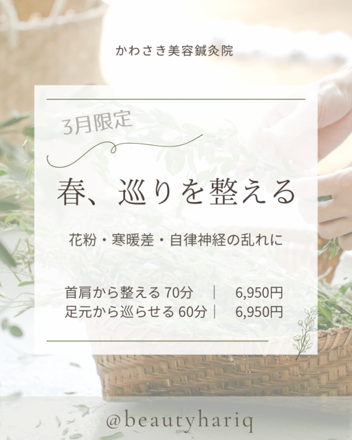 春、巡りを整える 首肩から整える 70分 足元から巡らせる 60分| 6,950F 6,950円