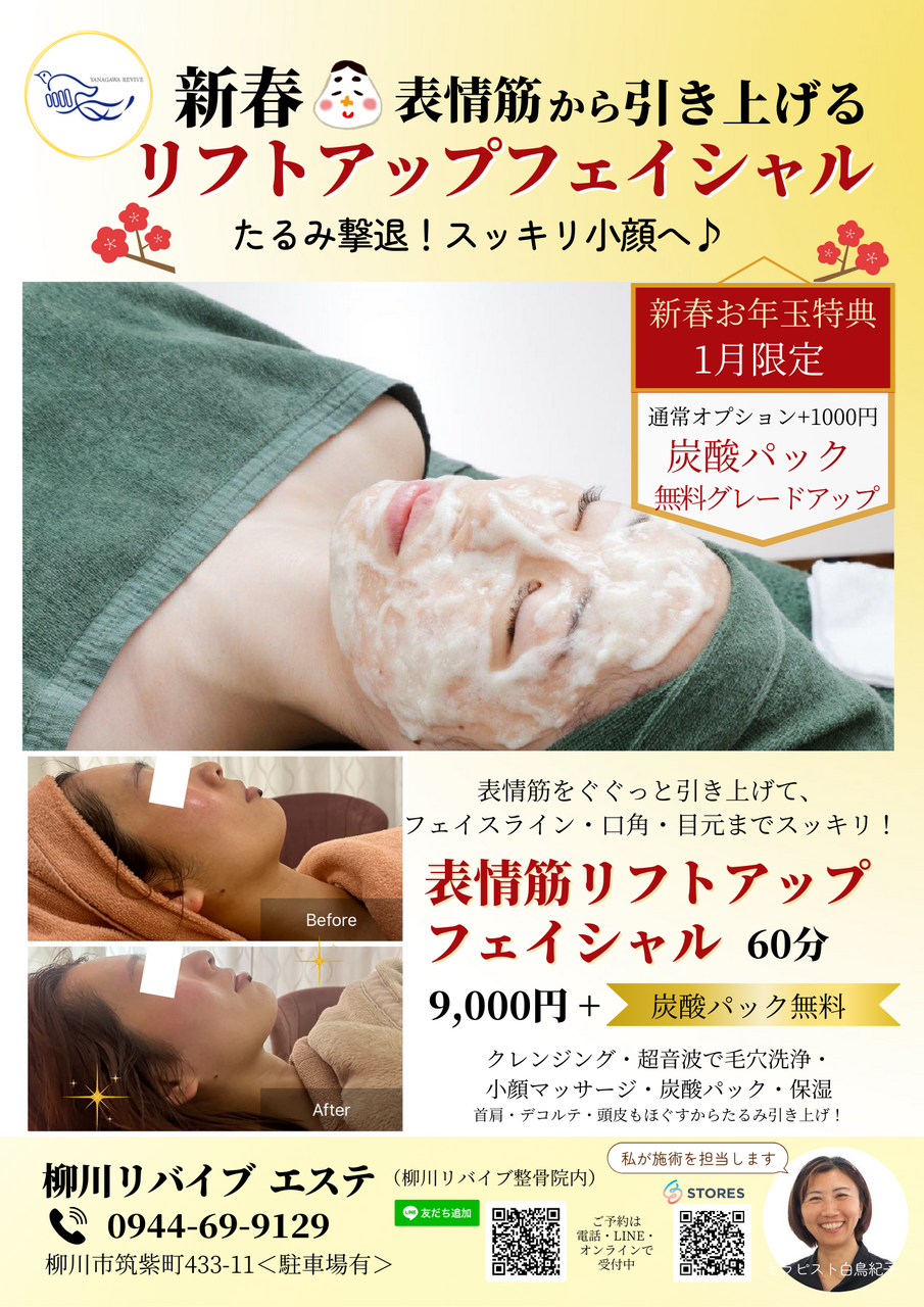 【お顔・1月限定】表情筋から引き上げるリフトアップフェイシャル|炭酸パック無料グレードアップ
