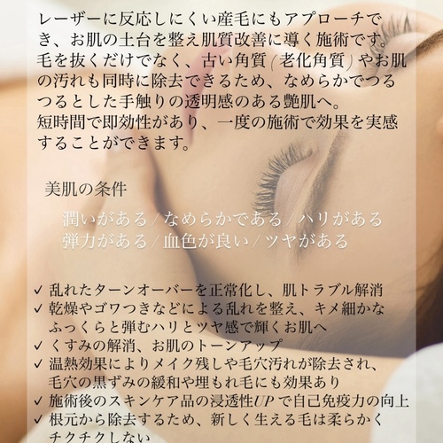 " ワックス脱毛 × トリートメント " で産毛、老化角質、お肌の汚れを除去&トリートメント効果で乾燥やごわつき、くすみ知らずのトラブルに負けない潤いが続くお肌へ導きます。