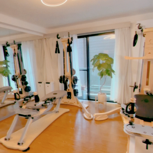 プーリータワーと呼ばれるジャイロトニック®︎メソッドの基本的なマシンから応用編ジャンピングストレッチングボード®︎、ジャイロトナー®︎と3種類のマシンを揃えた日本でも数少ない本格的スタジオ