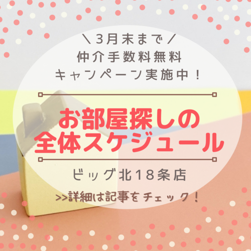 \お部屋探しの全体スケジュール&仲介料無料キャンペーン実施中♪/