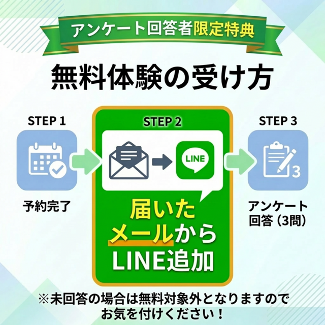 予約完了後、自動予約完了メールにてLINEを追加いただき、無料体験に必要なクーポンを取得してください!