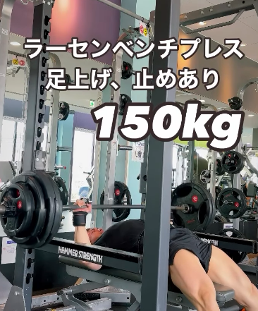 森林トレーナーのラーセンベンチプレス150kgの様子(足上げ)