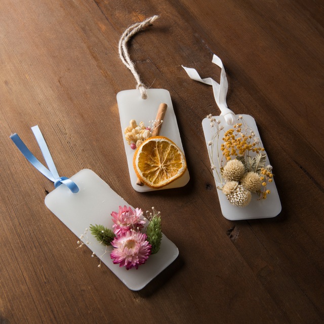 ドライフラワーを添えたアロマワックスバー。