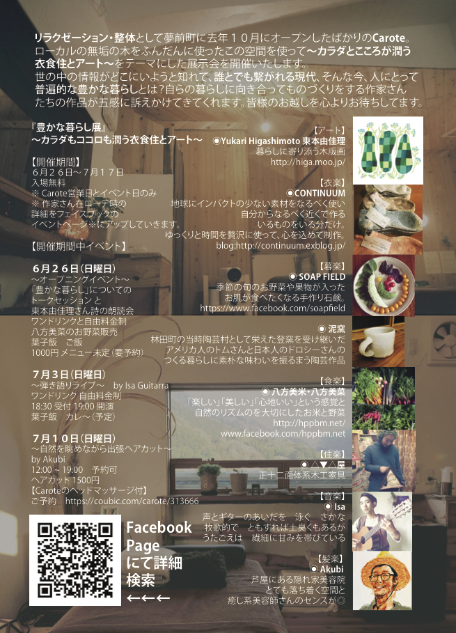 さて、豊かな暮らし展始まっています。平日はリラクゼーションの営業も通常通り行っているのでご予約お待ちしています。