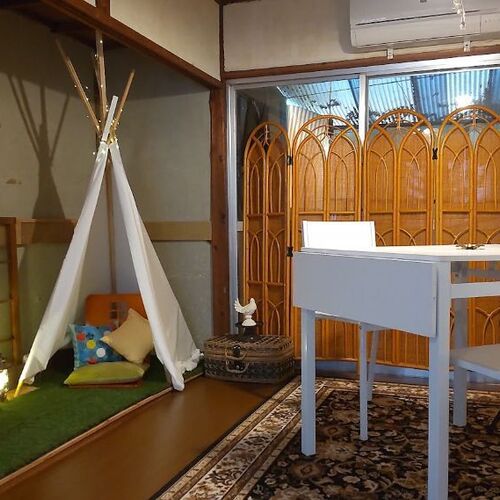 🍀1階は、落ち着いた色合いの空間に、遊び心のある小さな手作りティピーテントがあります。