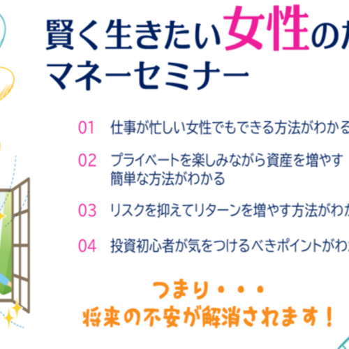 生命保険・住宅購入・資産運用(株式投資・投資信託・不動産投資など)さまざまなお金の情報提供をプロが初心者の方向けにセミナー・講座で行っています。お気軽にご参加ください。