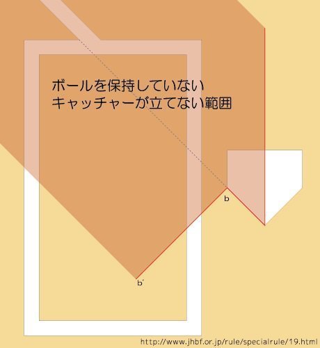 ボールを待つ時、図のようにベースの左半分のスペースを空けておかないといけない。そもそもここに立っている時点で適用!