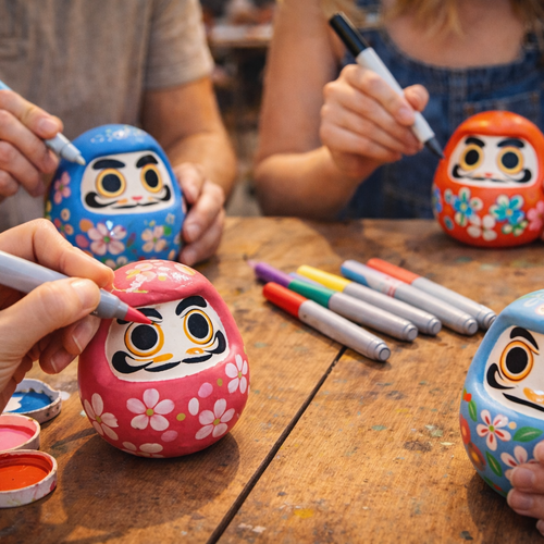 縁起物として親しまれているだるまや招き猫に、好きな色や模様を描いて、世界に一つだけのオリジナル作品を作ることができます。