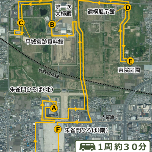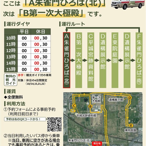 ※A:朱雀門ひろば(北)では一度降車いただきます。次の出発は約30分後です。