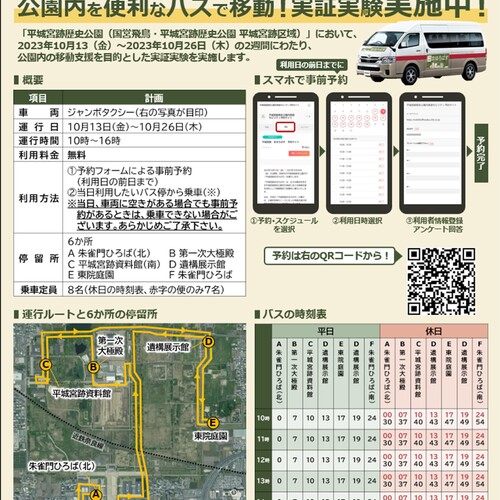 なお、今回の「平城宮跡まほろばす」の運行は、公園利用者のニーズに合った移動支援の実現性を検証することを目的としています。
