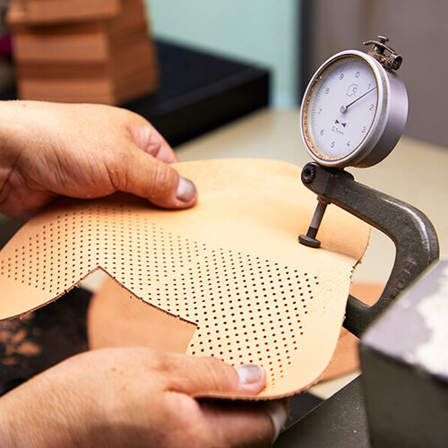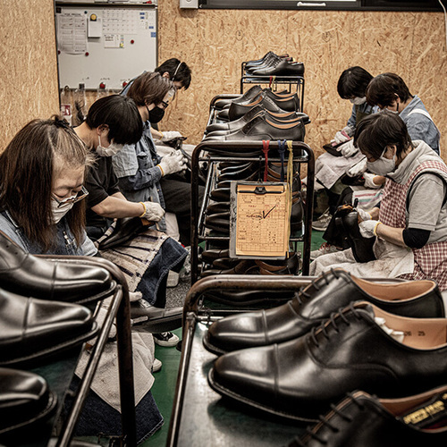 一人で一足仕上げる職人とは違い、流れ作業となっておりますので、各工程をチームで受け持ち、全員同じ仕事ができるよう、職人を教育し商品のクオリティーが均一になるように生産管理しております。
