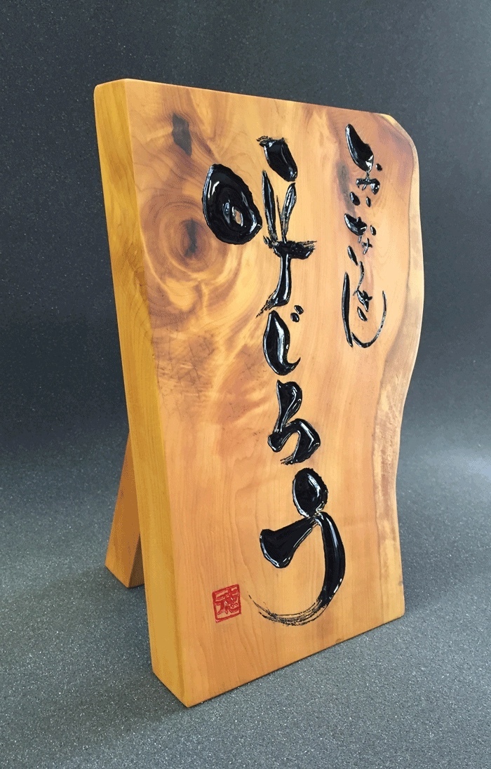 役者さんへの楽屋見舞いにメークが落ちないようにと一口サイズの上品なおいなりさんを店主徳永氏が心を込めて作っています。看板製作は’木と字の神林’の樋口氏。丹精込めて彫って下さいました。