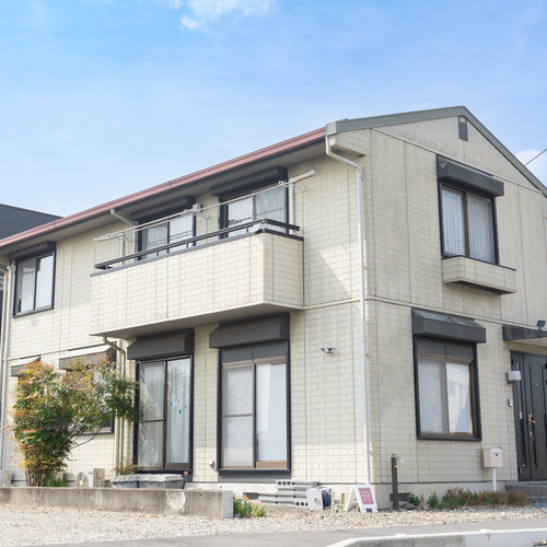 建物を正面に見て左側、ピンクの車が停まっている砂利の空いているスペースに停めて下さい。