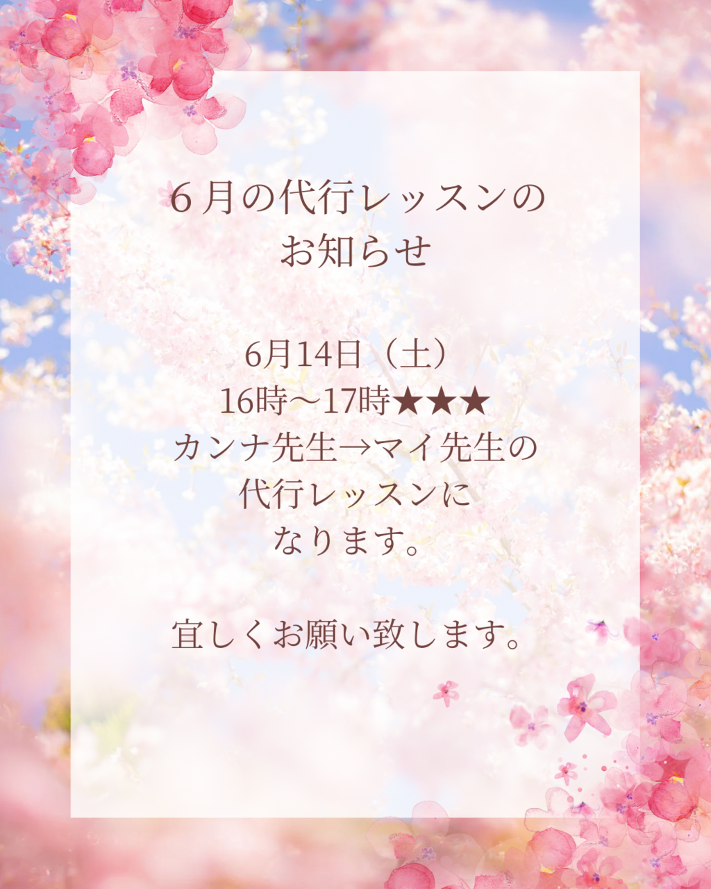 代行のお知らせ 6月14日(土)16時〜のレッスン