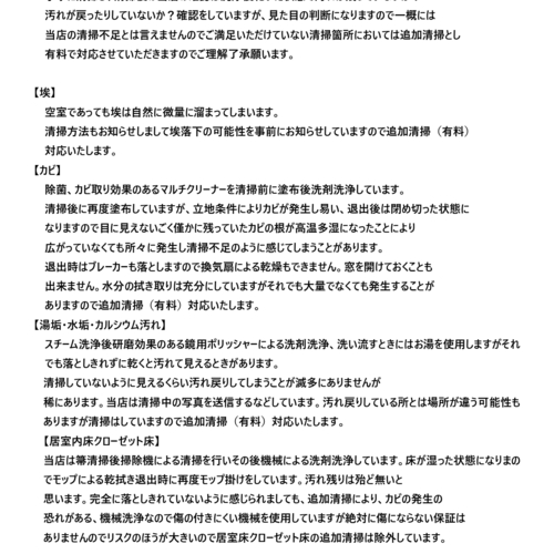 ご入居されてから室内清掃についての苦情には当店は対応いたしませんので無料のアフターサービスを