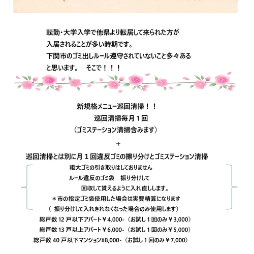 巡回清掃月1回+月1回ゴミステーション清掃と違反ゴミの振り分け!(ゴミ置き場清掃合計月2回になります。)