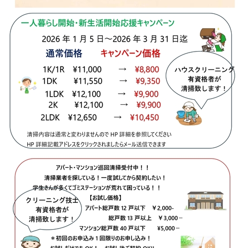 アパート・マンション巡回清掃お試し 好評につき対象アパート・マンション拡大!!!