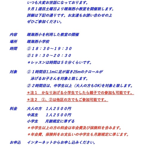 また、スタッフは大手スイミングクラブで10年以上指導をしてきたコーチに指導をお願いしていますので若いアルバイトコーチが、ただ流している指導ではありません。