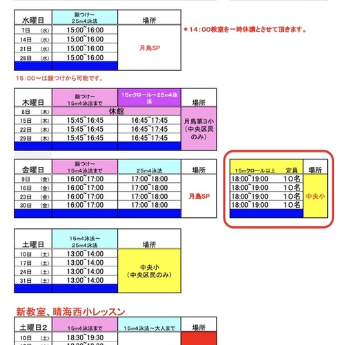 毎月の予定表を下記画像に添付しておりますので、どうぞご覧ください。
