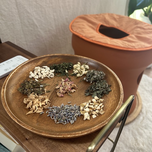 国産無農薬よもぎと30種類の選べるハーブと一緒によもぎ蒸しができます。