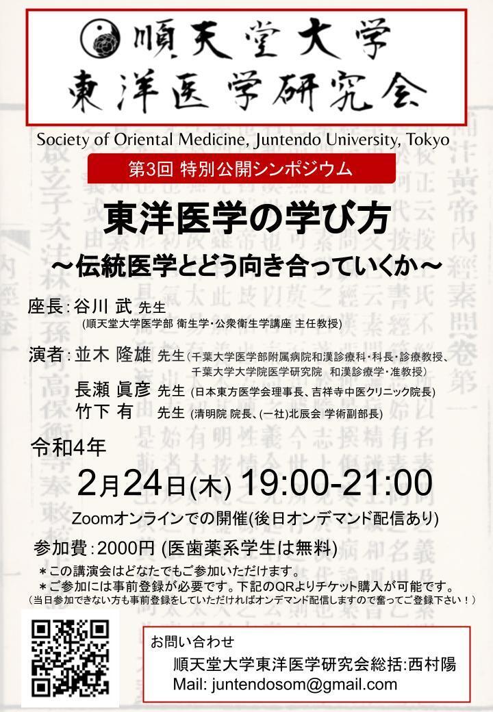 【2/24,19:00】第3回特別公開シンポジウム 「東洋医学の学び方 ~伝統医学とどう向き合っていくか~」 (順天堂大学東洋医学研究会)