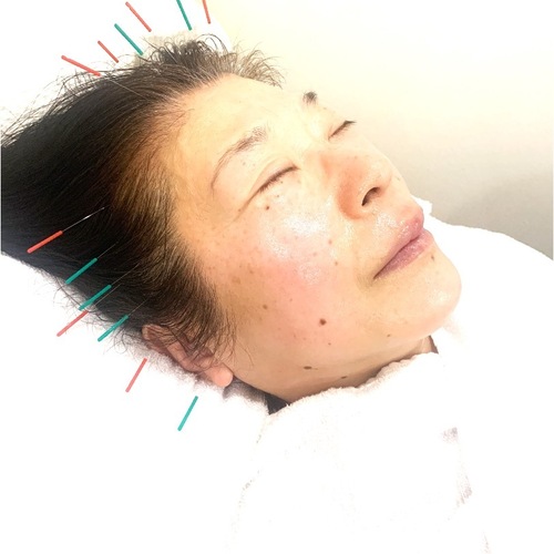 フェイスライン、口元、頬、目元、生え際と顔のリフトアップに必要なポイントに鍼を数十本打ち、ググッと引き上がった横顔へ。特別な日の前に、たるみの短期集中回復に。
