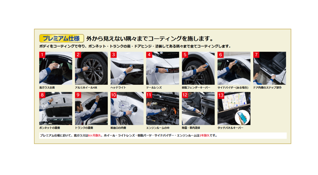 ガラス被膜と特殊なレジン被膜の二重の被膜でより強いツヤと、強撥水性を出します。