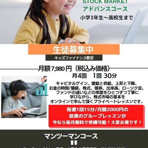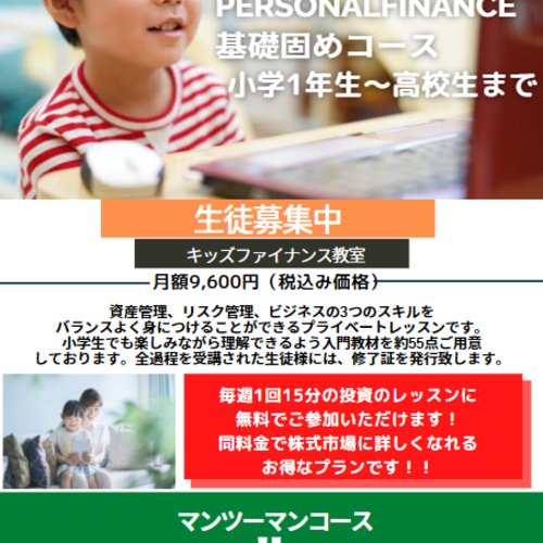 子どもたちの金融リテラシーを向上させるために欧米で導入されている「パーソナルファイナンス」(お金の教育)を2018年より大阪でスタートしたバックグラウンドを活かし、2020年からオンラインレッスンを開始!ご自宅でも楽しく金融知識の構築をサポート致します。