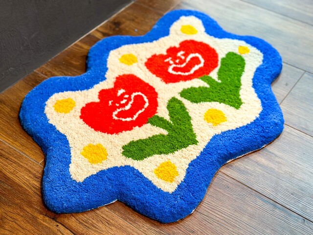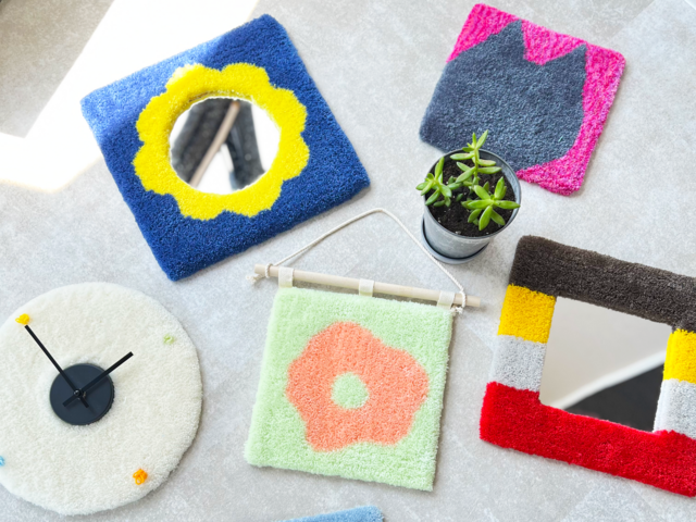去年初めて体験し、2度目に挑戦しました。モノ作りが好きなので、構想から仕上げまで考えるのが楽しいです。タフティングのガンは重さがあり、思うように打てない時もありましたが、少しずつ色が打ち込まれ、仕上がっていく自身の作品を見ていくと満足度が上がりますね。今回はミラーにしたのですが仕上がりが楽しみです!お世話になりました。