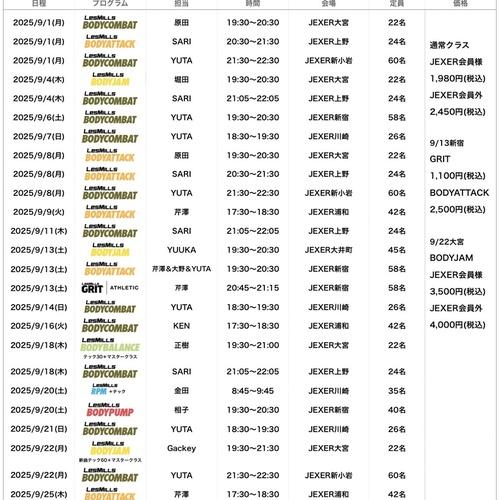 2025年 9 月 JEXER各店舗スケジュール