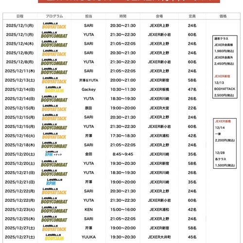 2025年 12月 JEXER各店舗スケジュール
