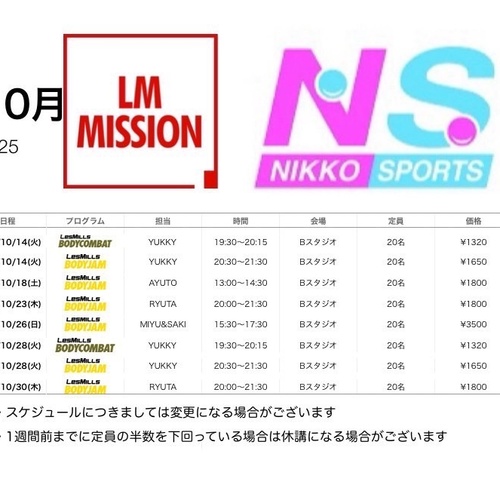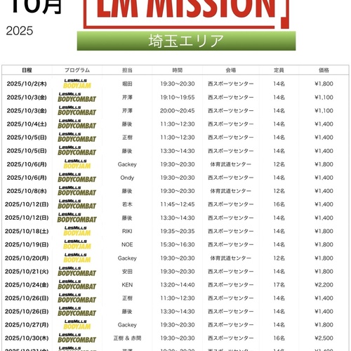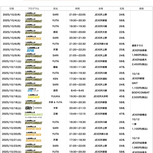 2025年10月 関西BODYJAM予約スケジュール