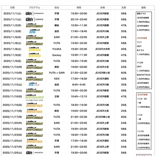 2025年 11月 JEXER各店舗スケジュール