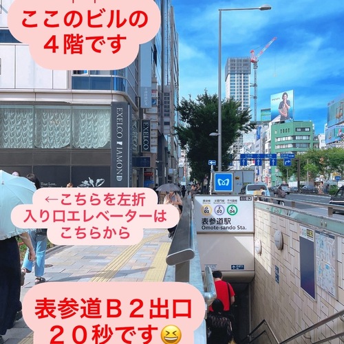 東京メトロ表参道駅B2出口を出て、青山通りを表参道交差点方面に歩くとすぐにエクセルコダイヤモンドが1階にあるビルの4階です。エクセルコダイヤモンドの手前の道を左に入るとエレベーターの入口があります。青山岡田ビルディング4階【tete a tete】内になります。