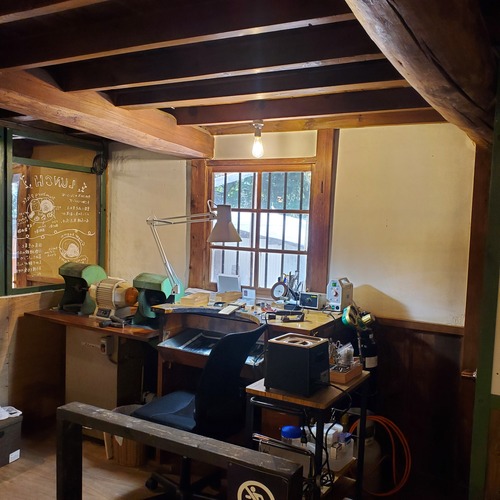 ワークショップでは まるで物語の中に入ったような古民家の一角にあるアトリエで 普段使用している机や道具を利用して行います。ちょっとした職人気分を味わえると好評です!