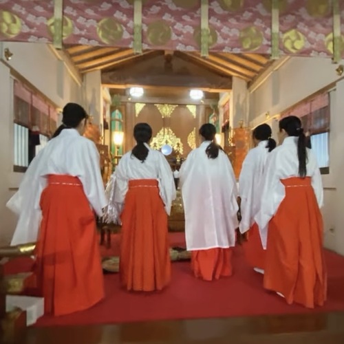 巫女装束を着て、巫女舞やオリジナル御朱印作りなど、神社でのさまざまなお仕事を体験できます。