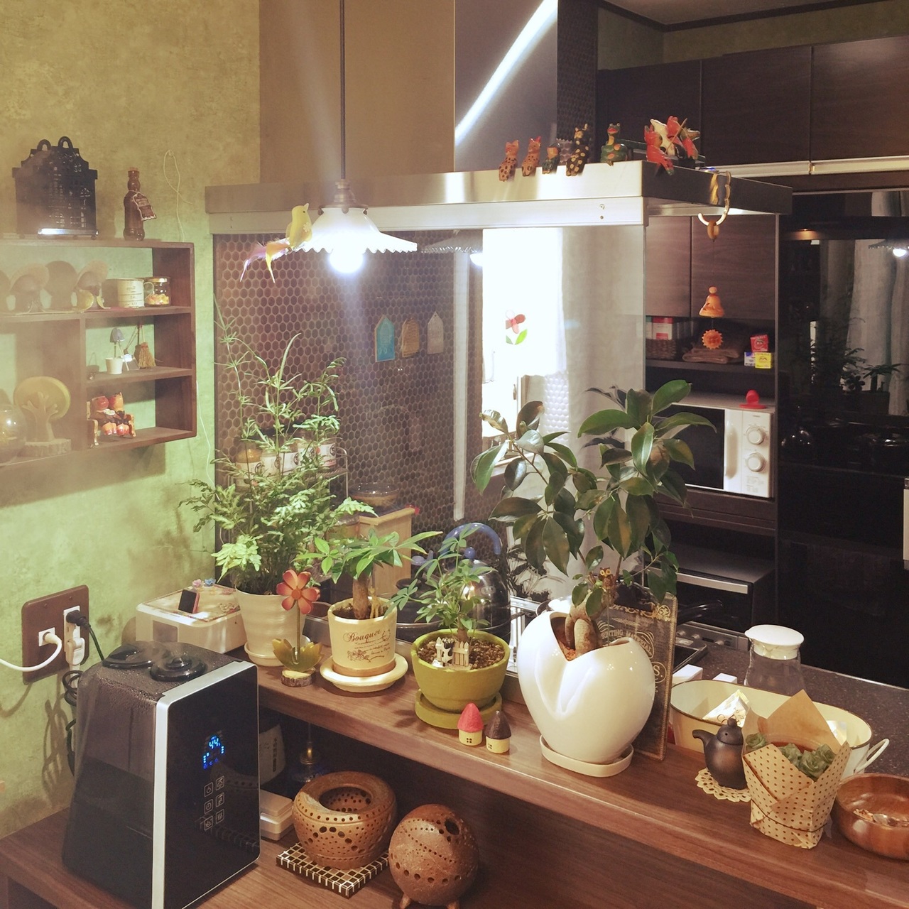 正面は壁ではなく板ガラス。観葉植物を眺めて癒されながら、正面に配したテレビを観て情報を得ながら料理も楽しめます。