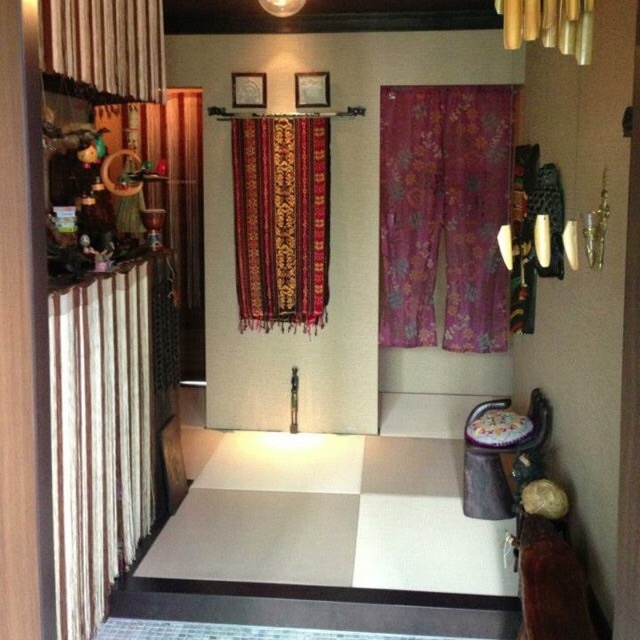 下足入れはオーナー自らのハンドメイド作品。アジアンスタイルにこだわつた造りになつています。
