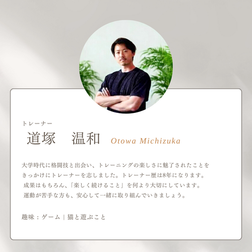初めてのパーソナルジムで緊張していましたが、トレーナーさんがとても話しやすく安心できました!